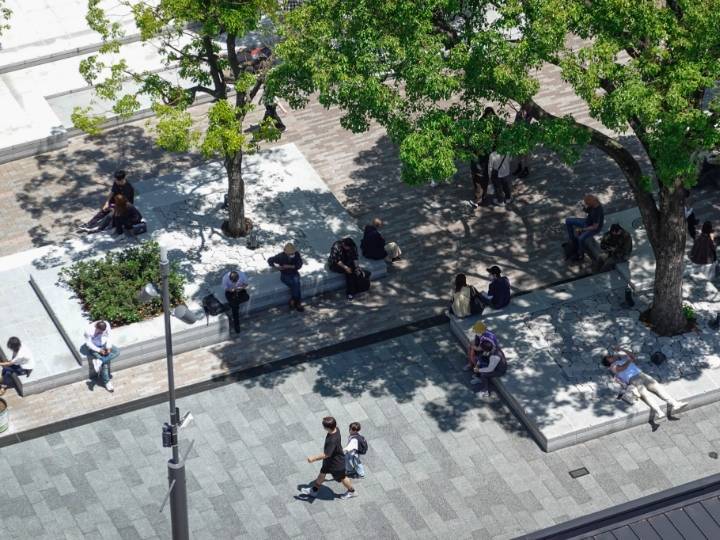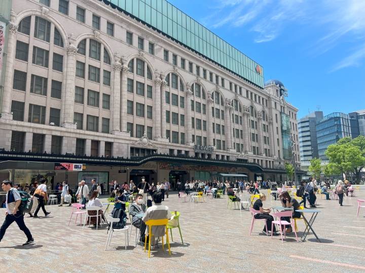 なんば広場は、駅前のタクシープールや車道等の道路空間を再編し生み出した、人のための広場です。