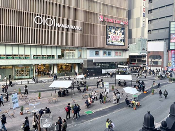 なんば駅前は、関西国際空港に直結し、大阪ミナミの中心に位置する多くの人が行き交う場所です。このなんば駅前の道路空間を「人のための広場」に変える取組は、2008年に地元発意で始まりました。2011年には広場化を本格的に推進するために「なんば安全安心にぎわいのまちづくり協議会」が発足しました。