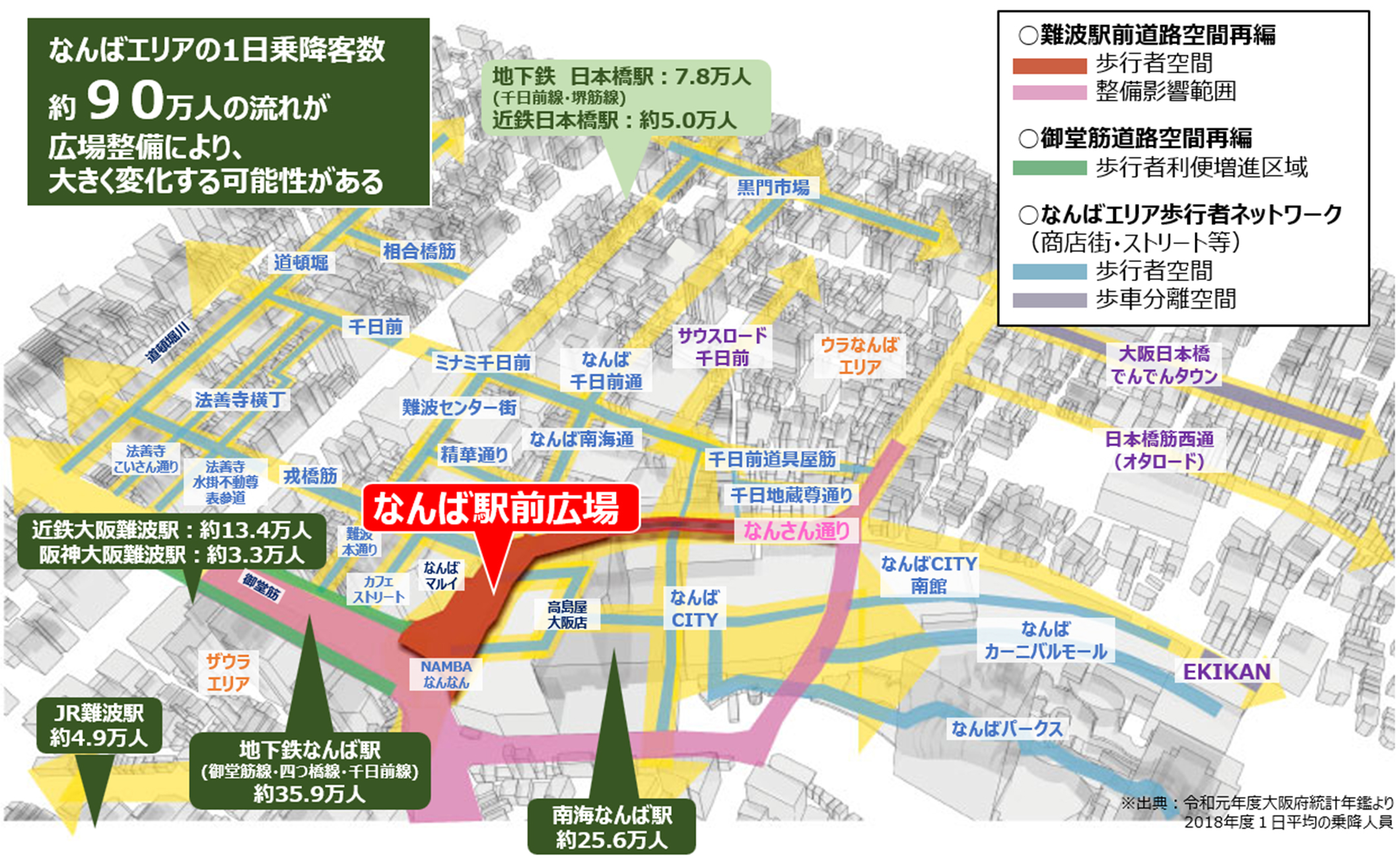 なんばエリアは、商店街などの個性のある歩行者空間がネットワークされた「歩いて楽しいまち」です。駅前を広場化することにより、このネットワークを強化するとともに、なんば広場が待ち合わせや休憩のできる場所となることで、まちへの滞留時間を伸ばし、回遊性を向上させていくことを目指しています。