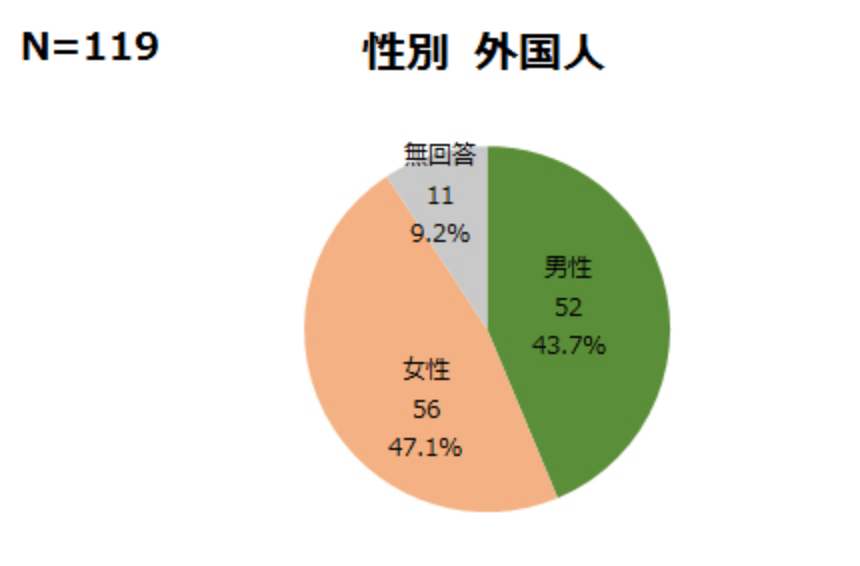 - 日本人、外国人ともに女性のほうがやや多い。