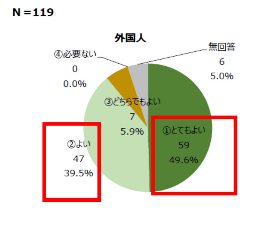 - 日本人・外国人ともに、約9割の方が歩行者空間化「とてもよい・よい」と評価している。