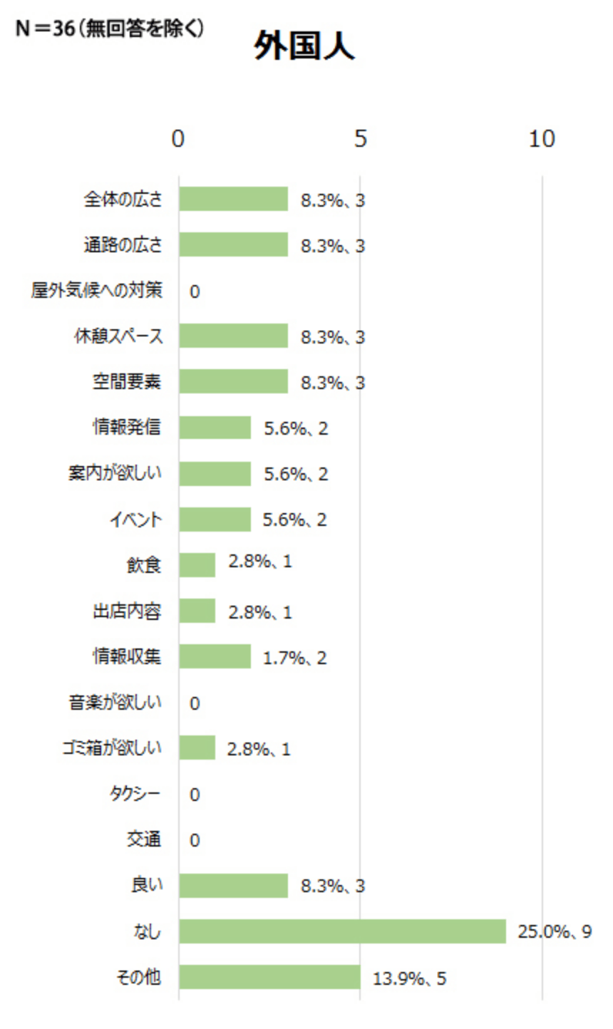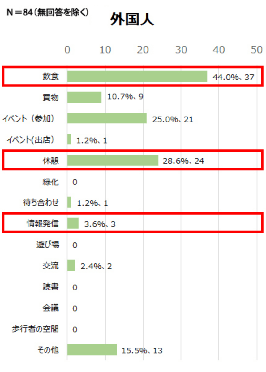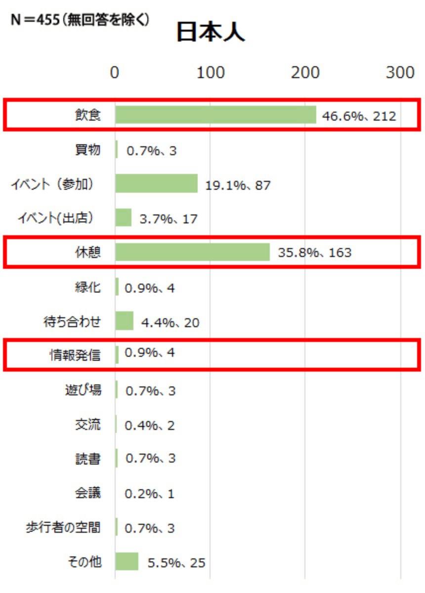 - 日本人・外国人ともに「飲食」「休憩」を挙げている割合が高く、広場でゆったりと過ごすことを求めている。