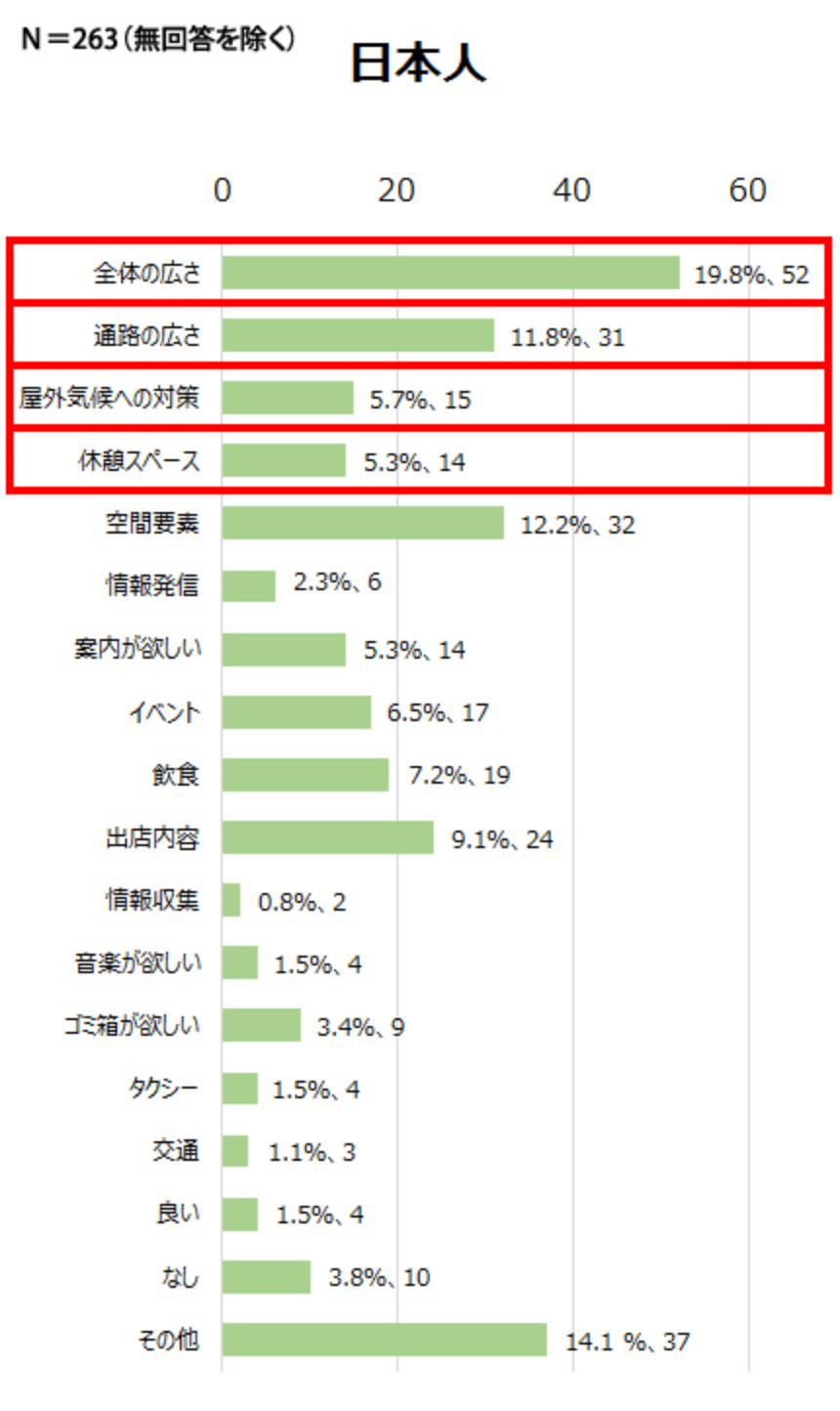 - 日本人、外国人ともに休憩スペースの評価が高い。