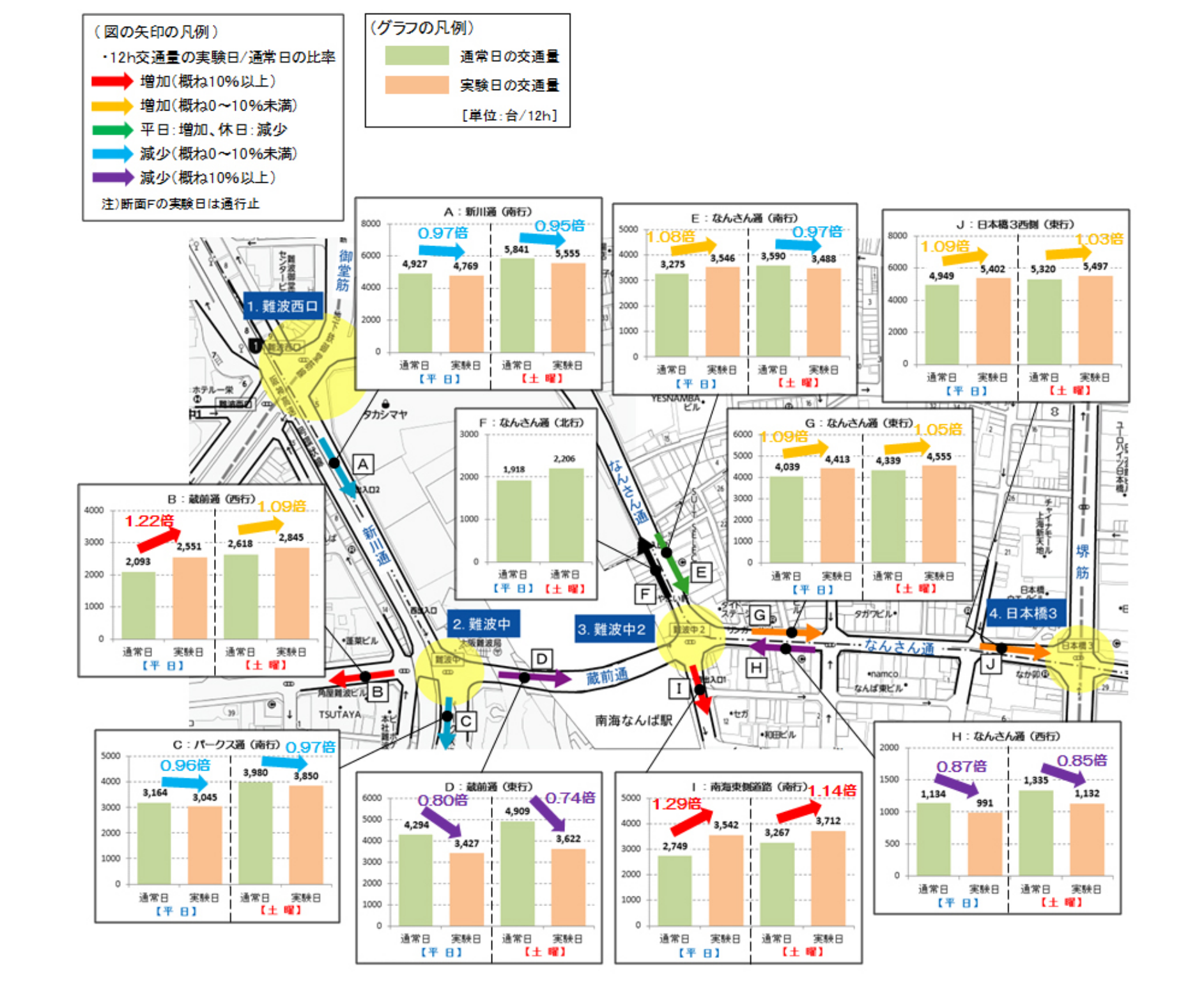 ・実験中の自動車交通量は、特に、難波中交差点西行き及び難波中2交差点南行きの交通量が増加し、難波中交差点東行き及び日本橋3交差点西行き交通量が減少