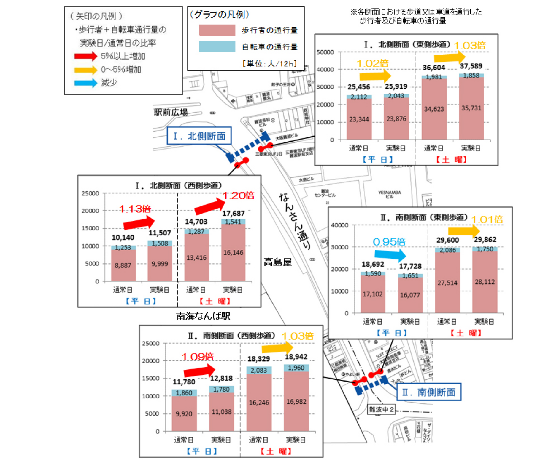 ・実験中の歩行者通行量及び自転車通行量は、特に、なんば駅前の広場に近接した北側断面の西側歩道において、平日・休日とも通常日より増加