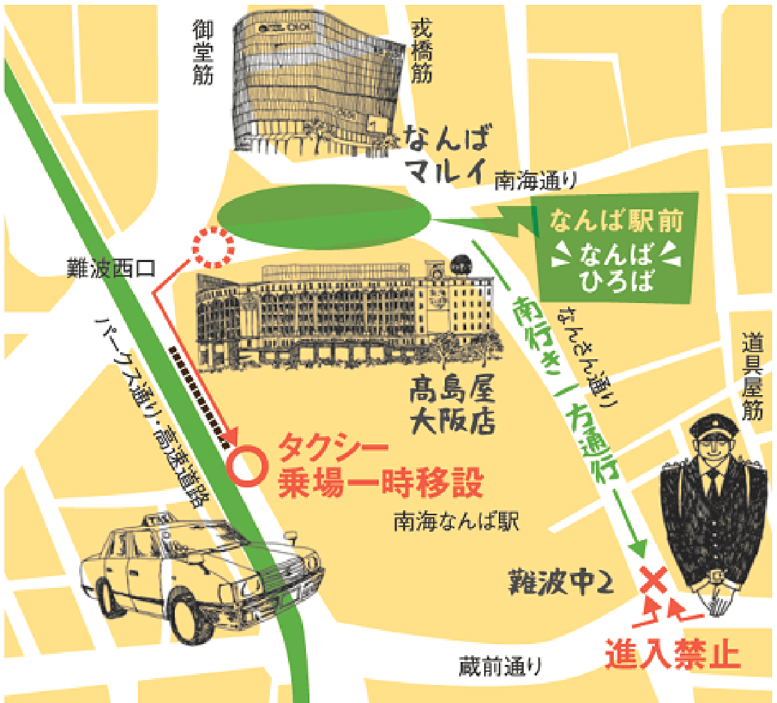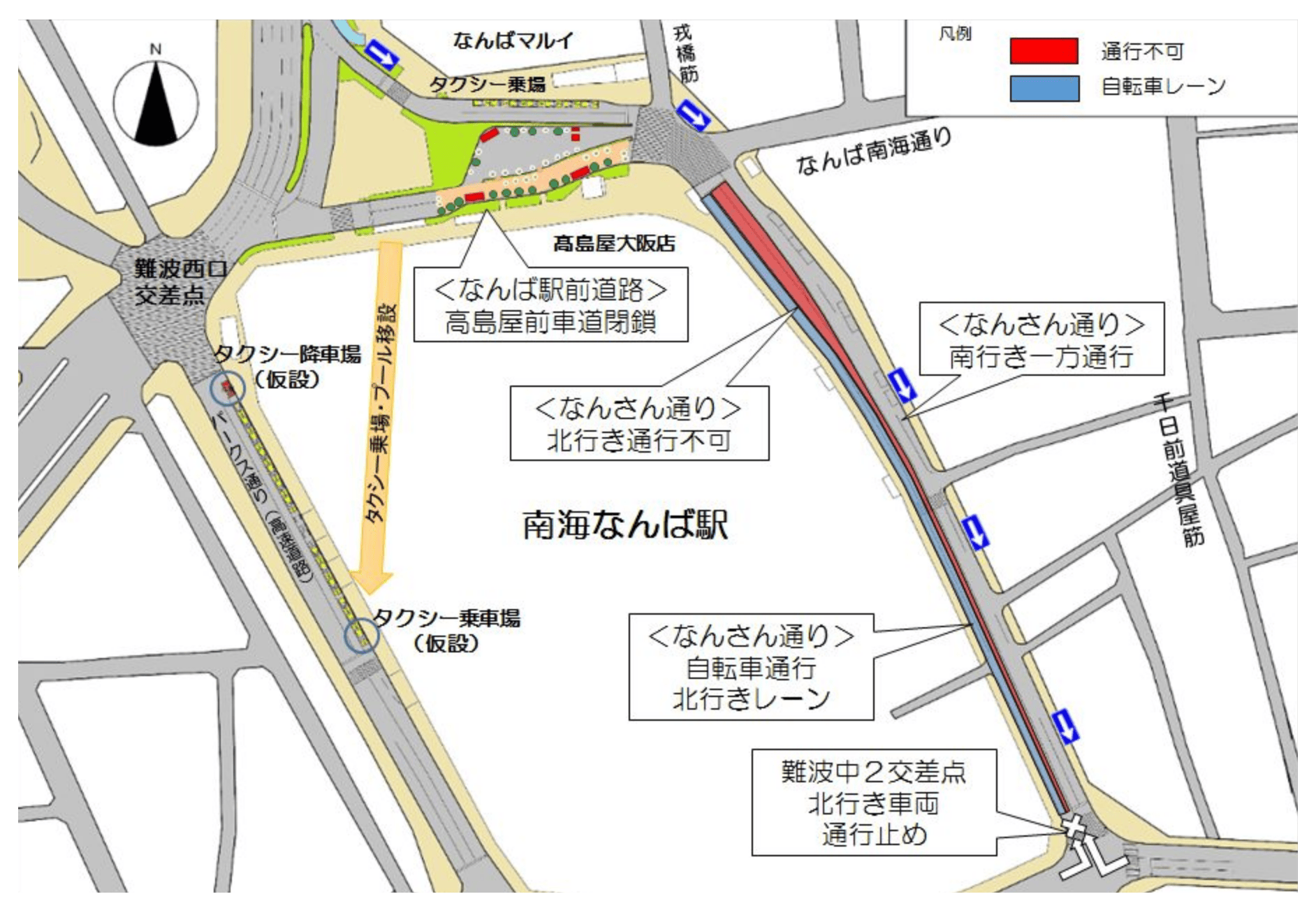 - 難波西口交差点から難波中2交差点までのなんさん通りを南行き一方通行化(北行きの通行ができません)。