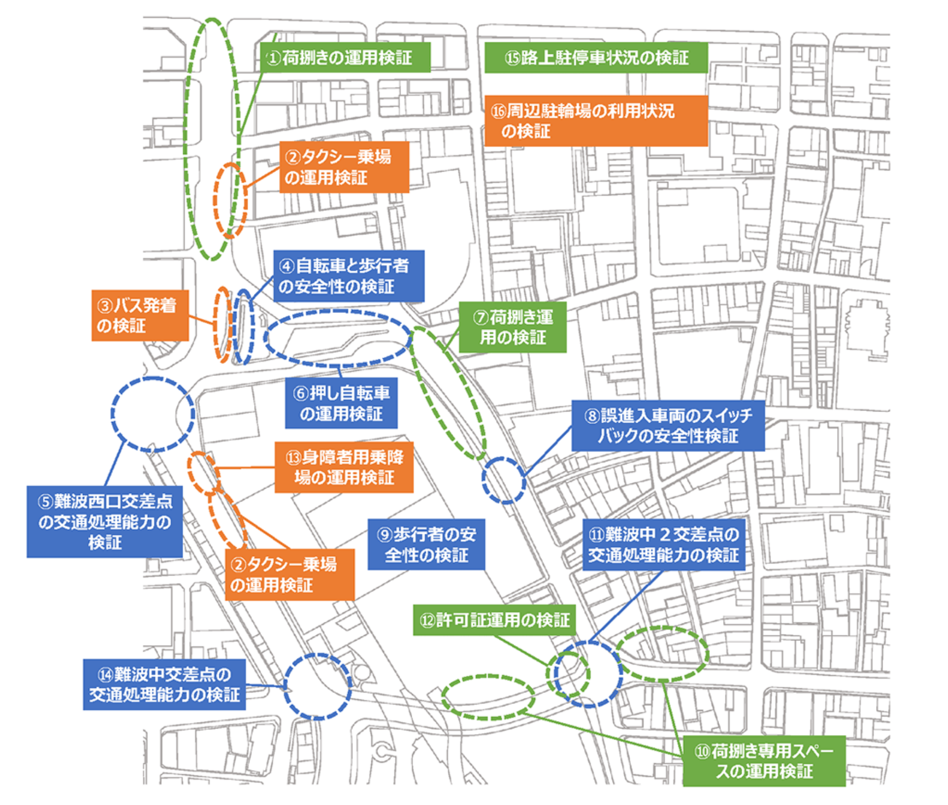- 自転車と歩行者の安全性、難波西口交差点・難波中二交差点・難波中交差点の交通処理能力、押し自転車の運用、誤進入車両のスイッチバックの安全性、歩行者の安全性の検証を行いました。