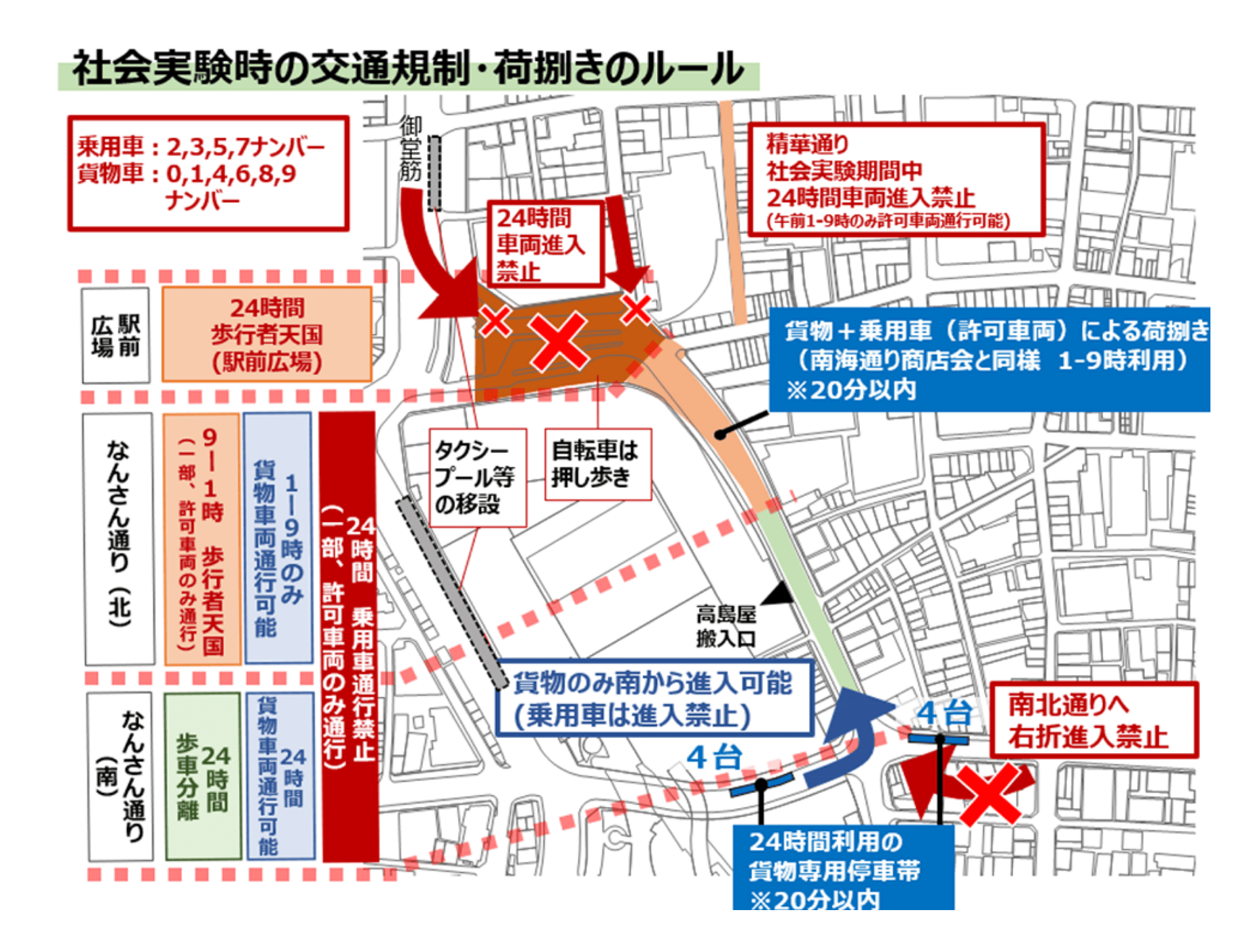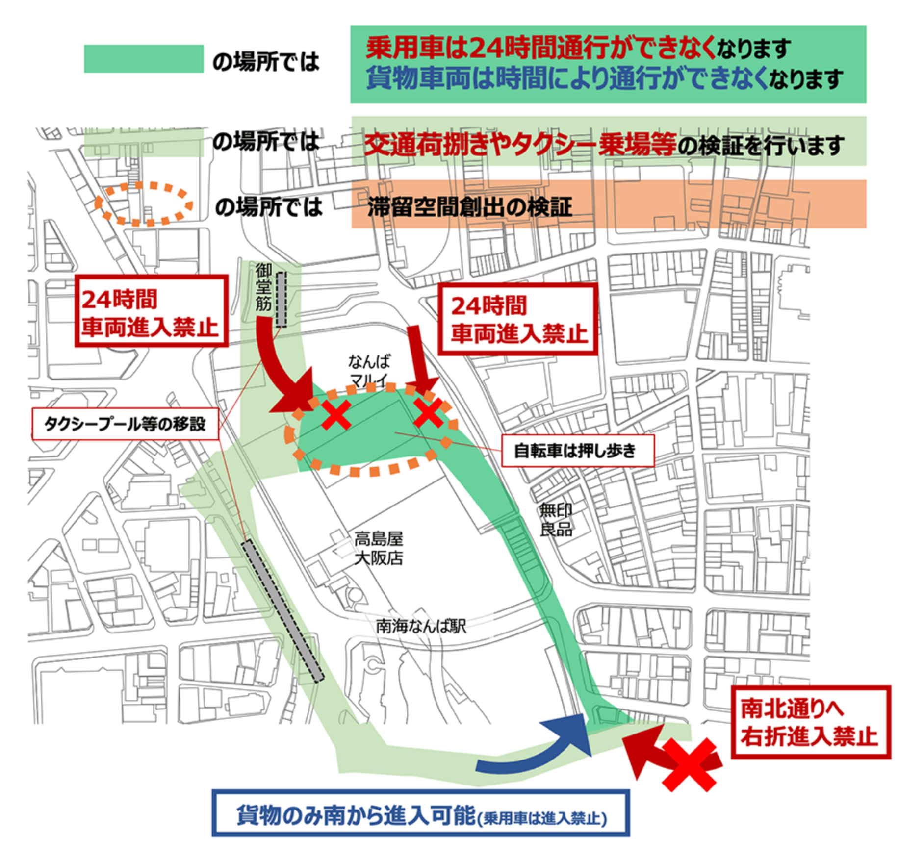 なんば駅周辺の交通荷捌きや運用の安全性、歩行者空間の利活用を検証するための社会実験を行いました。