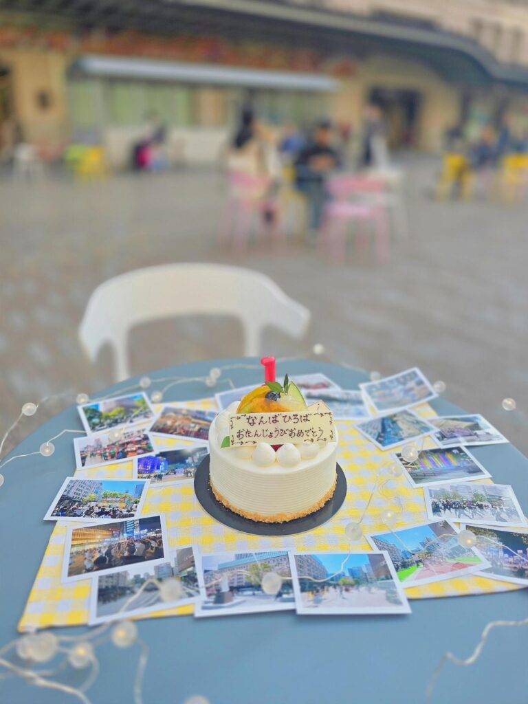 この写真は、なんば広場一周年の前日に、この1年を振り返る写真を共に、ケーキでお祝いした時のものです。