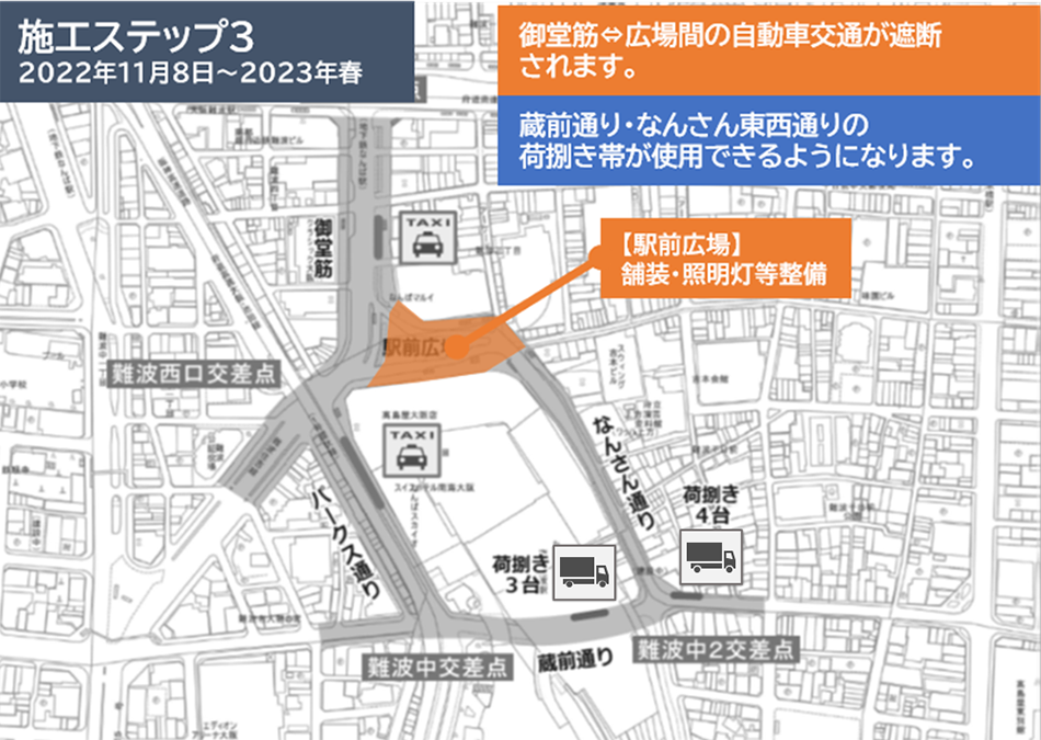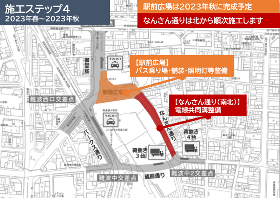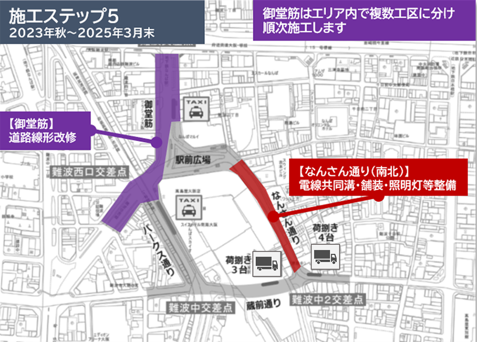 工事期間: 2022年9月20日~2025年3月末(予定)工事時間: 原則として夜間工事 ※施工ステップ3は昼夜工事事業主体: 大阪市建設局工事発注者: 南海電気鉄道株式会社 070-7823-1390施工者: 大林道路株式会社 06-6684-8003工事内容: 施工ステップ1~5のとおり※工事の進捗により若干 変更となる場合があります。