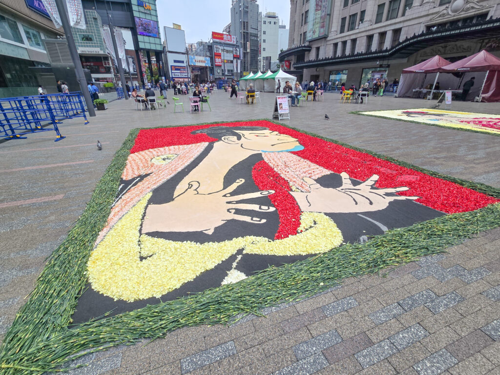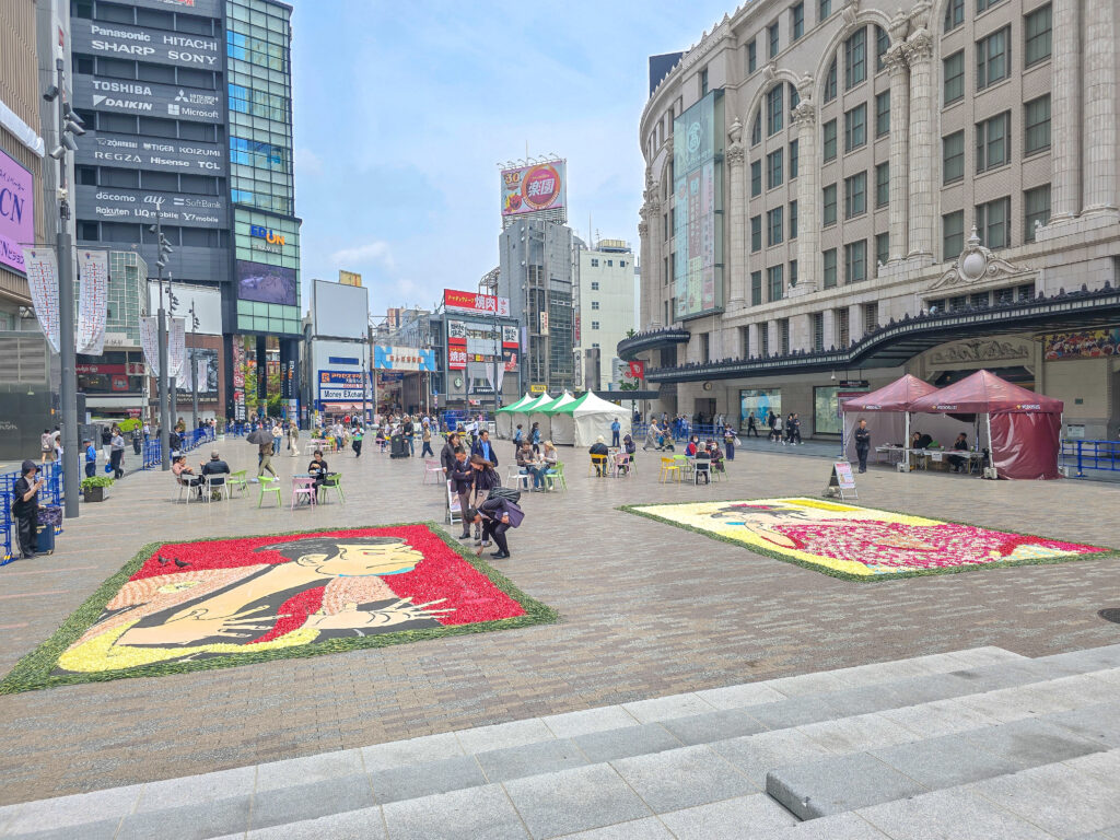 華やかなフラワーカーペットは、写真撮影スポットとして大人気!多くの方が足を止め、美しい花の芸術を堪能されていました。今回の目玉プログラムの一つ、フラワーカーペットクイズラリーも大盛況!なんば広場だけでなく、御堂筋一体となったプログラムで、御堂筋を楽しく回遊し、フラワーカーペットの絵柄の中に隠されたクイズの答えを探す、ユニークな企画に多くの方が挑戦していました。