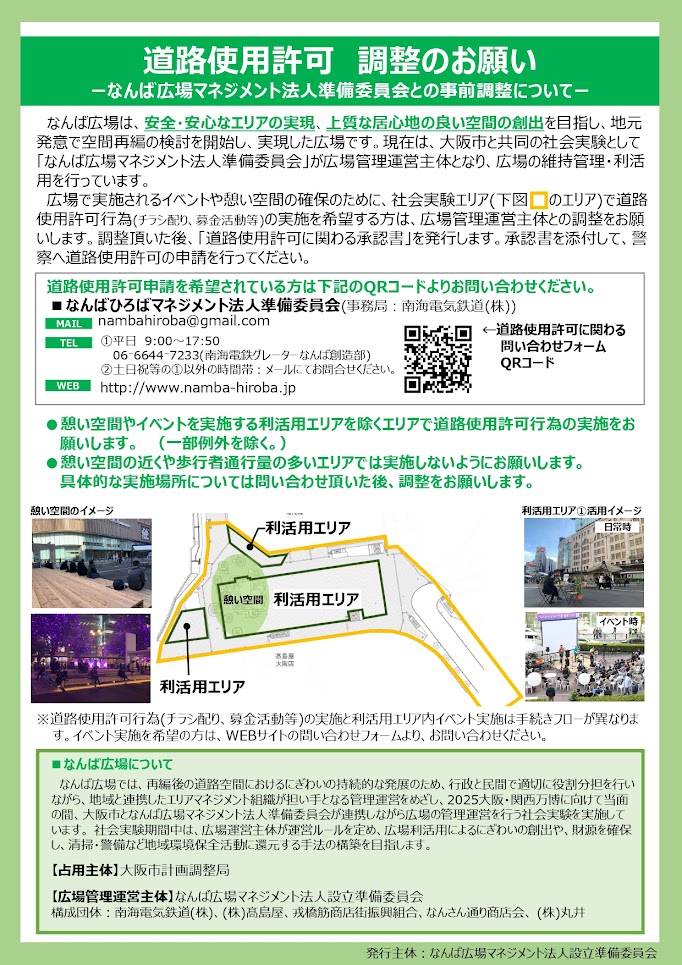 なんば広場は、安全・安心なエリアの実現、上質な居心地の良い空間の創出を目指し、地元発意で空間再編の検討を開始し、実現した広場です。現在は、大阪市と共同の社会実験として「なんば広場マネジメント法人準備委員会」が広場管理運営主体となり、広場の維持管理・利活用を行っています。
